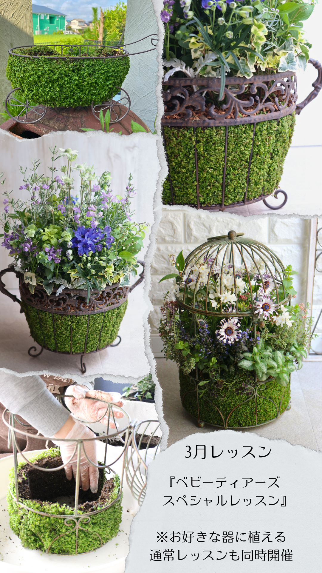 また、ベビーディアーズではなく、お好きな器に春のお花をブリコラージュする通常レッスンも上記の日にちで同時開催。「額縁プランター」のレッスンも可能です。